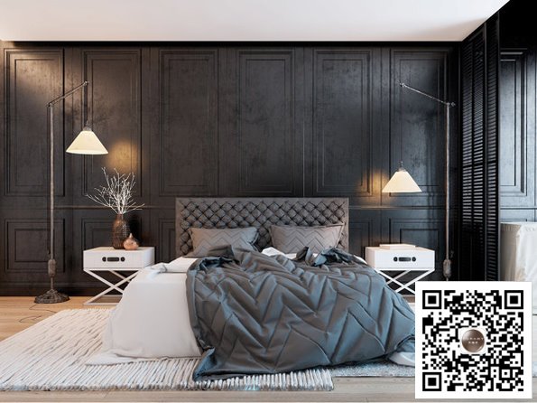 黑色靠背的主臥室床頭搭配兩個白色現(xiàn)代簡約的床頭柜,對稱的創(chuàng)意落地燈,搭配奢華質感的床品,設計師用這些軟裝元素詮釋一個經(jīng)典舒適的現(xiàn)代睡眠空間。