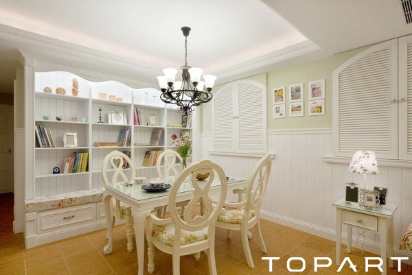 小角落上是放置了餐桌,吃放便可以很方便,這種設(shè)計(jì)減少了空間與空間間的閉合性,讓其很方便舒適。而每個(gè)細(xì)節(jié)的設(shè)計(jì)無可挑剔。就連精致的小臺(tái)燈也是晶瑩剔透,處處透著玲瓏小巧的特色。而餐桌餐椅的設(shè)計(jì)更值得稱贊。布藝的坐墊將清新的花給描繪了出來,栩栩如生。