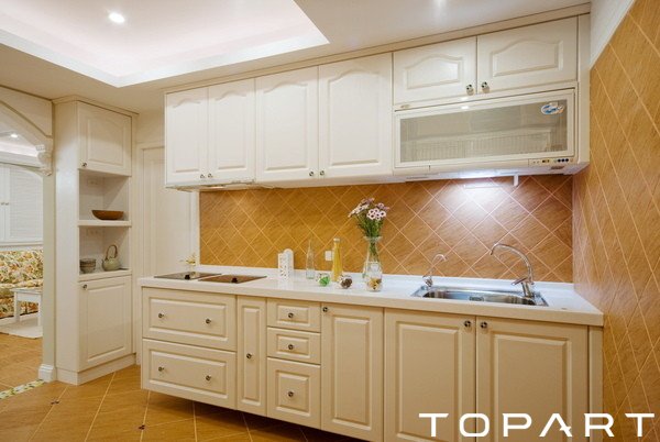 廚房的設(shè)計(jì)極為簡(jiǎn)潔,地面與墻面色彩差不多,土黃色,而安置了一長方形的整體櫥柜,象牙白,干凈整潔,頂上有吊柜,左側(cè)也有靠墻柜子。