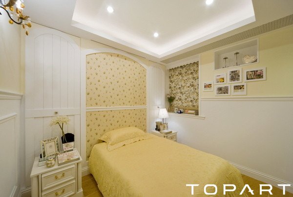 臥室布置的更為溫馨,墻面掛上了不少有趣的相框,可以緬懷童年。床品也是米黃色,與整個(gè)風(fēng)格搭配。