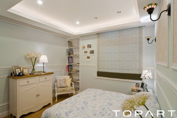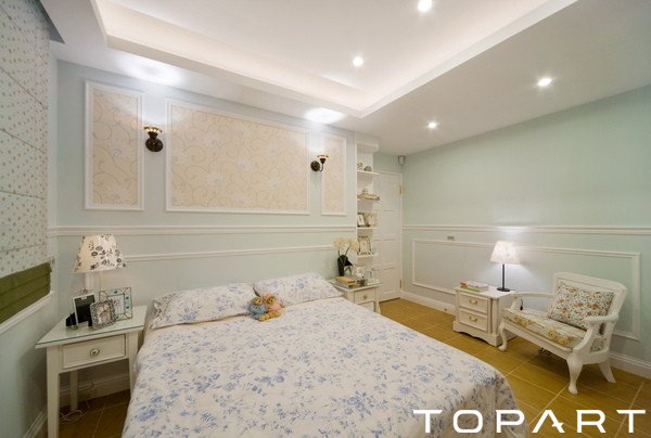這款臥室一改以往的米黃色,換成了清新的綠色,同時(shí)依舊有不少濃郁的田園氣息所要表達(dá)。
