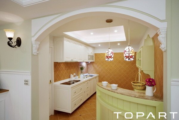 廚房小吧臺(tái)上面的燈具造型有些復(fù)古,懷舊氣息明顯。