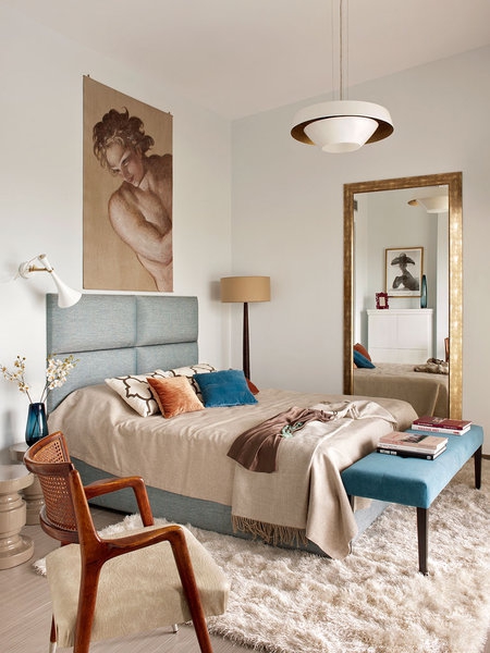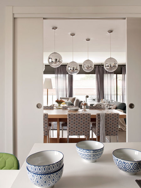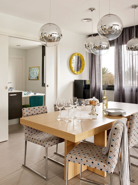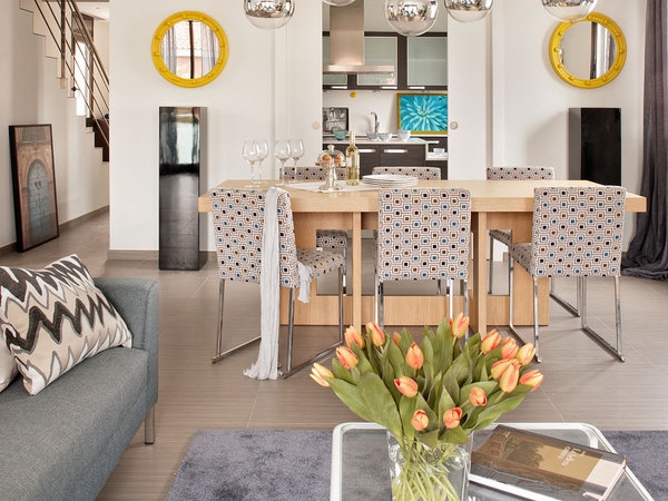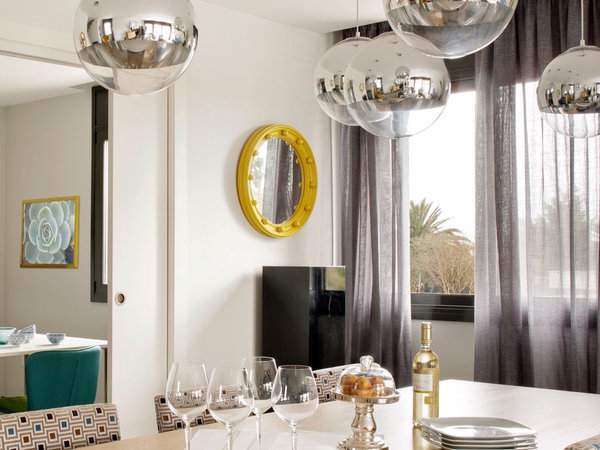 家里的空間和自然光通過達(dá)里亞Cenotto規(guī)劃ecclectic的窗戶透進(jìn)來,用不同風(fēng)格的裝飾,吸引注意力在每一個(gè)環(huán)境。例如餐桌上的吊燈或臥室梳妝臺的幾何印花。